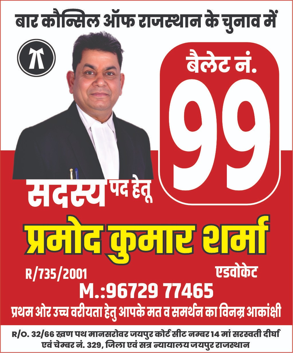 — Adv. Pramod Kumar SharmaR/O. 32/66 स्वण पथ मानसरोवर जयपुर कोर्ट सीट नम्बर 14 मां सरस्वती दीर्घा एवं चेम्बर नं. 329, जिला एवं सत्र न्यायालय जयपुर राजस्थान